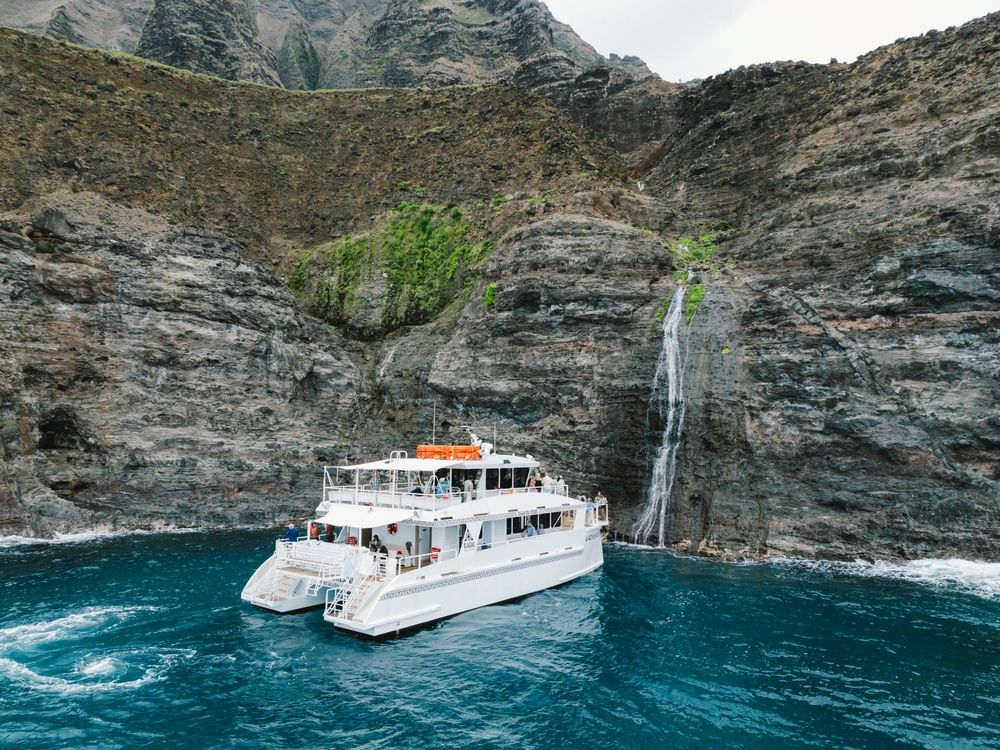 There’s no better way to spend an afternoon on Garden Isle, than aboard our brand-new 65-foot double-decker Luxury Catamaran, Lady Kailani. Watch the legendary Nā Pali Coast glow as the sun sinks into the Pacific, painting the sea cliffs and waterfalls in breathtaking color.